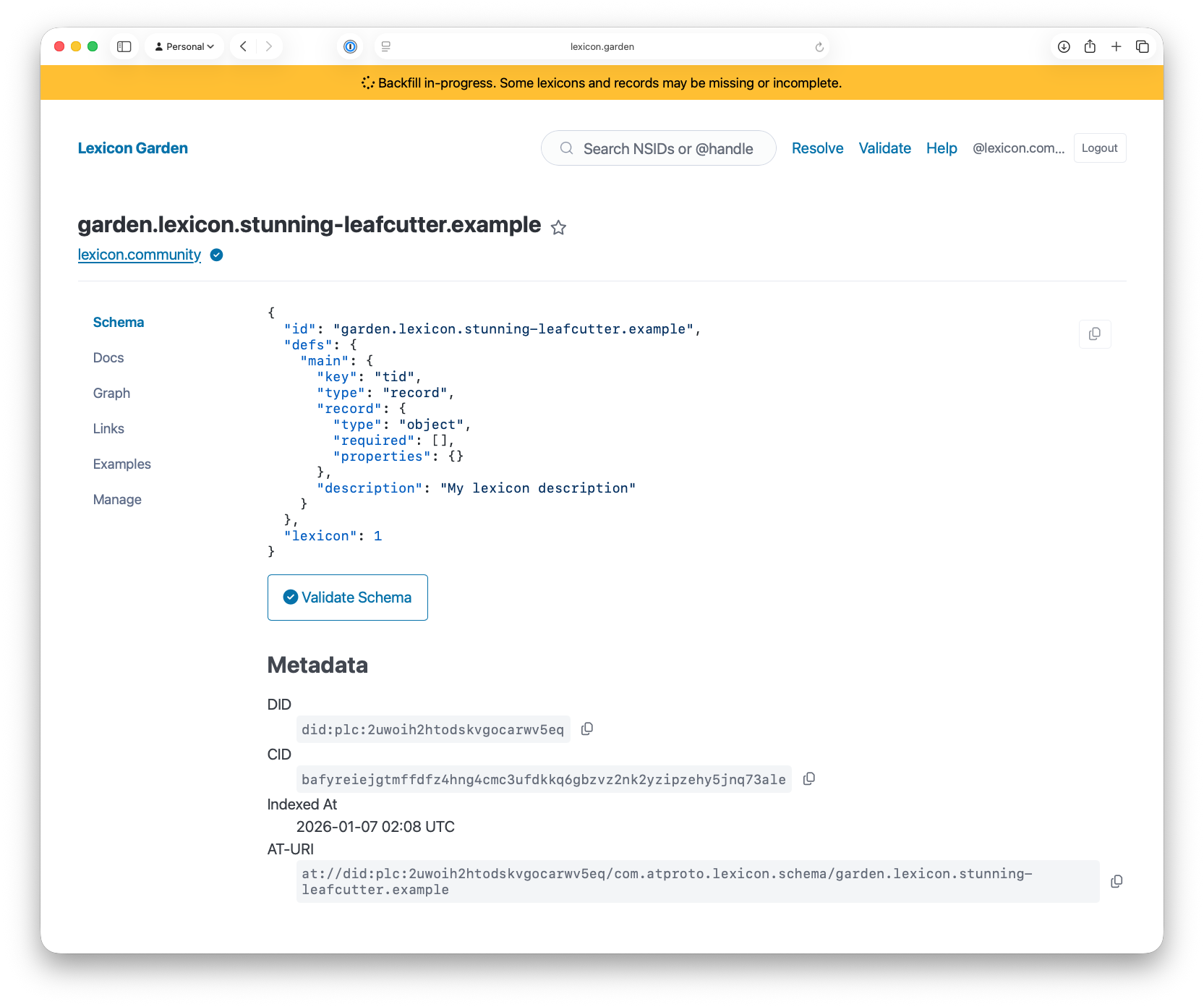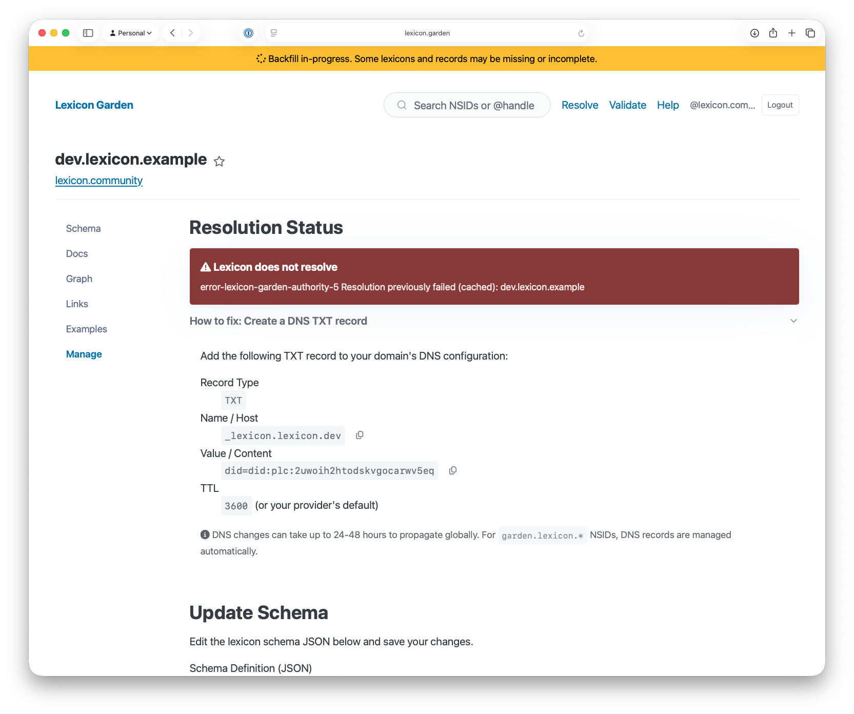 This turns Lexicon Garden into a real development environment for trying out new schemas. You can create a lexicon, test it, and change its structure without dealing with DNS or deployments. If you use your own domains, the manage page will show you exactly which DNS records to add for resolution to work.