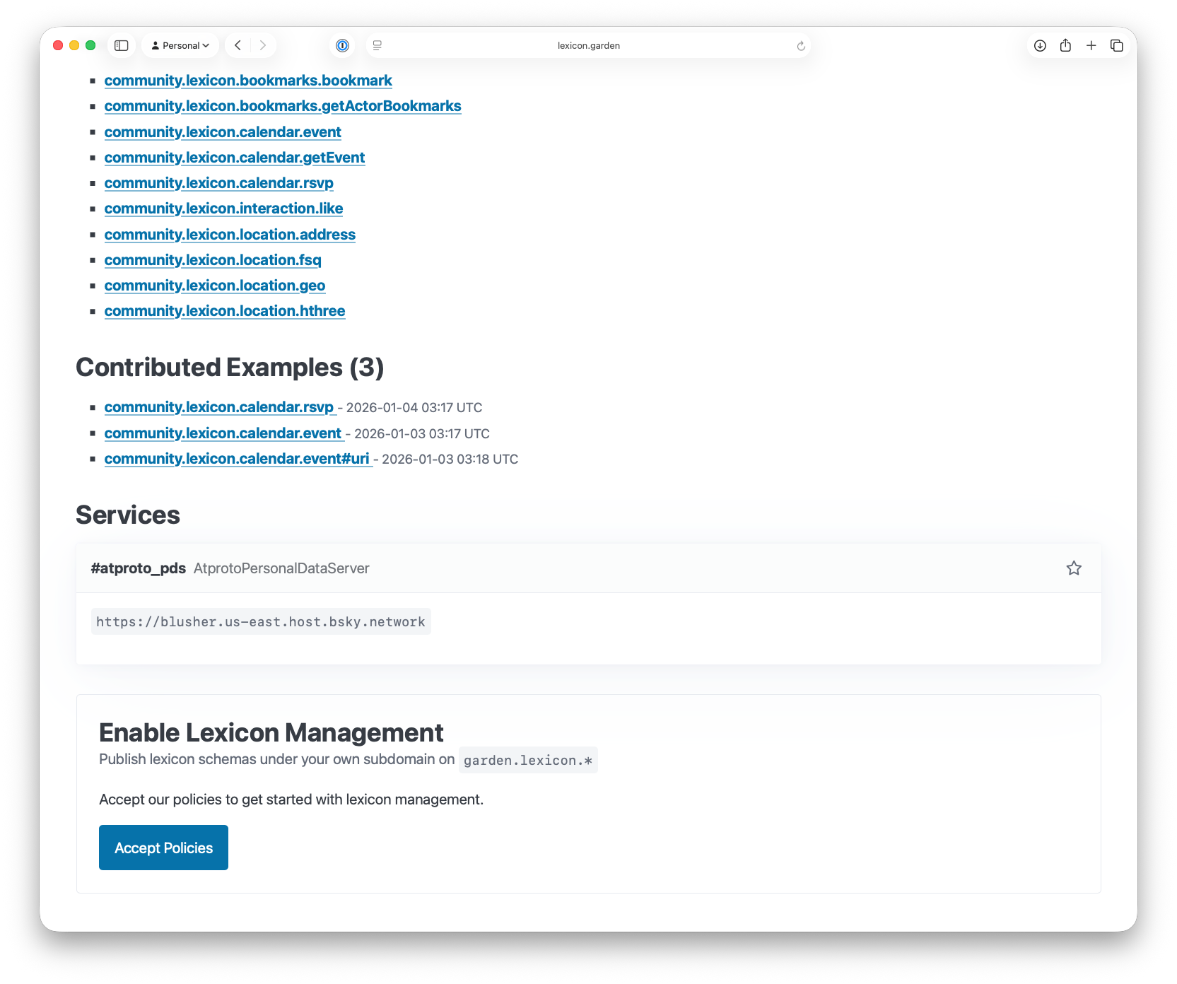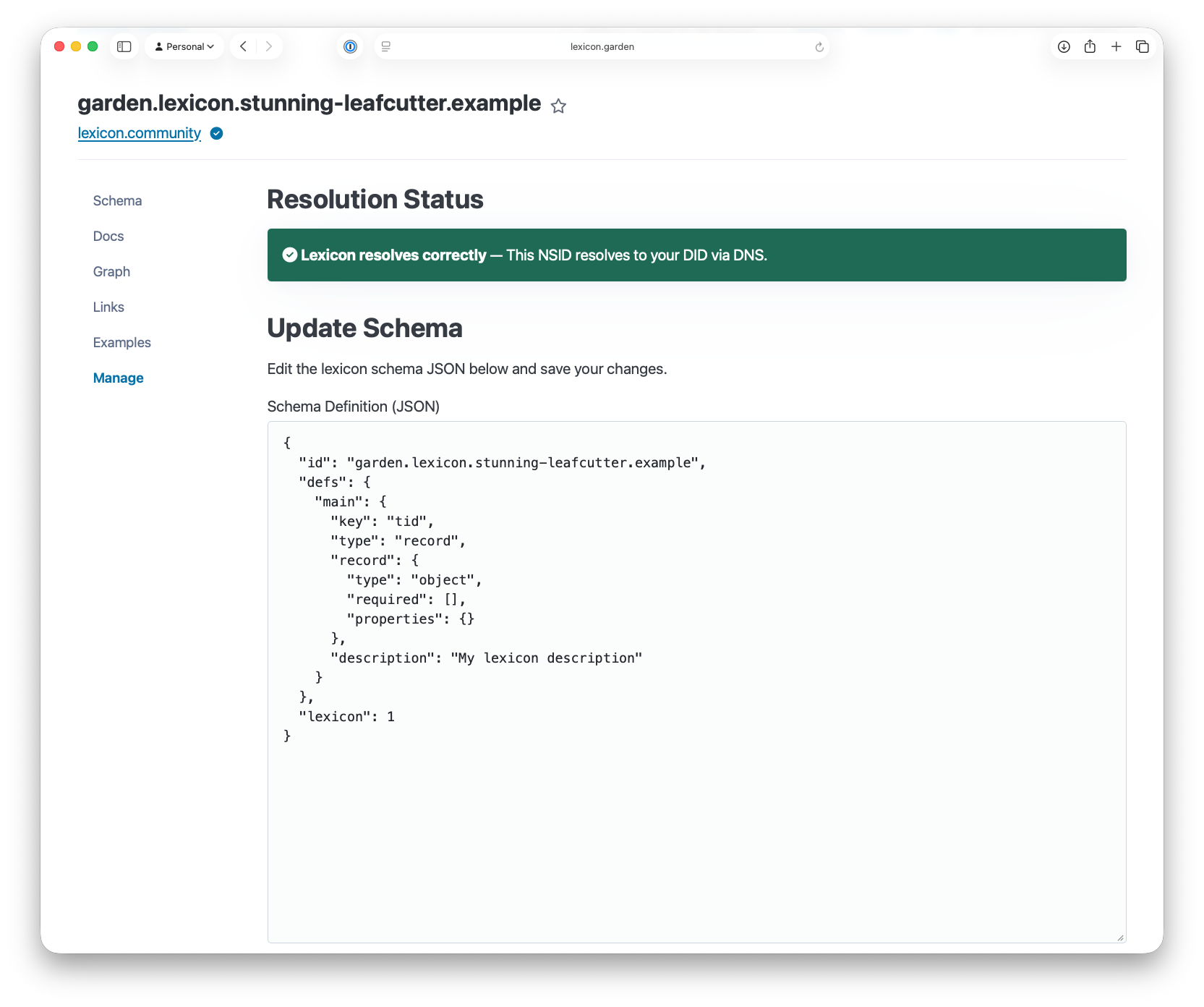 After you enable this feature, you can create lexicons under your Lexicon Garden subdomain or manage lexicons on domains you own. When you view a lexicon you own, you’ll see a new "Manage" section. There, you can check the resolution status and edit the schema definition directly.