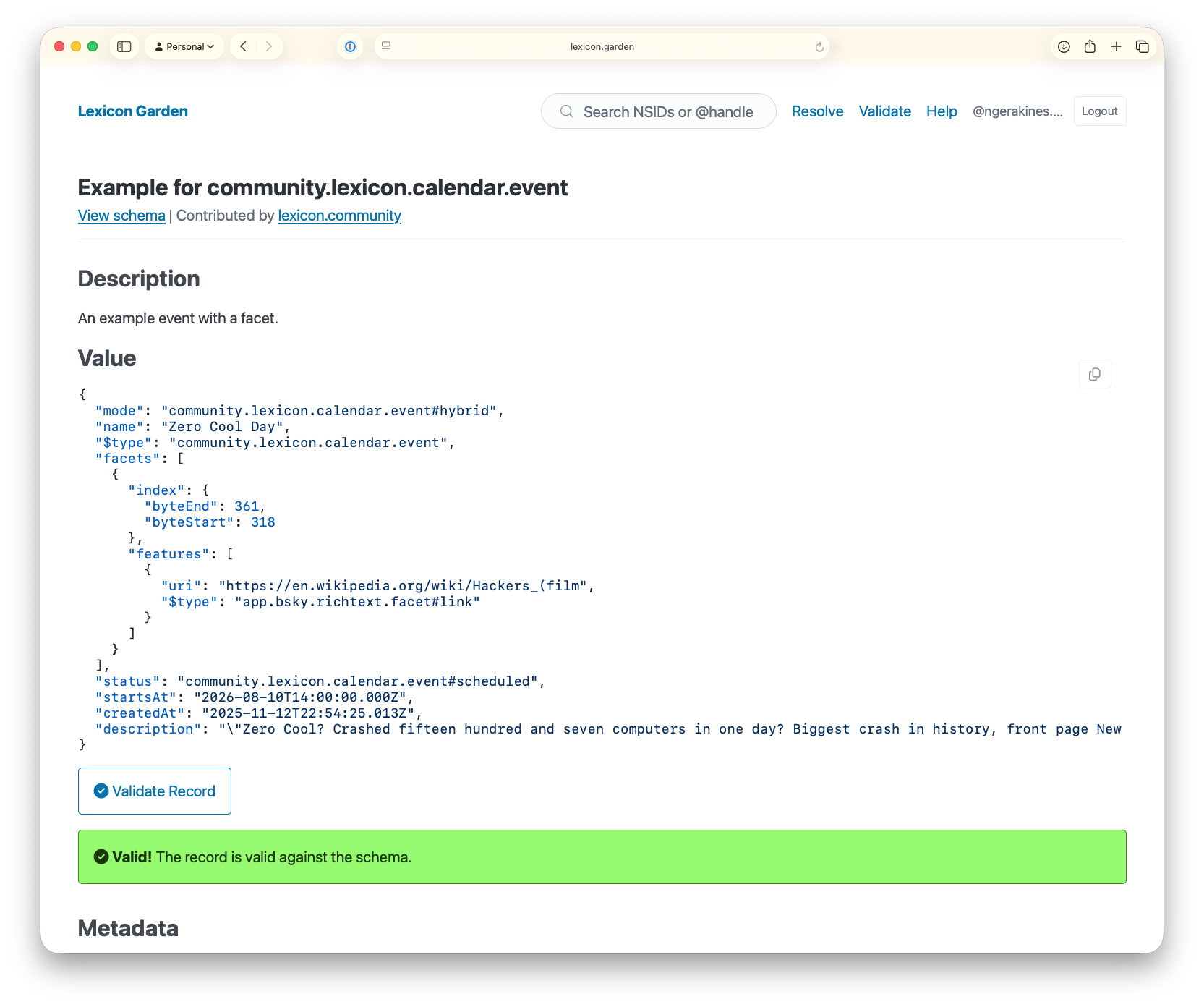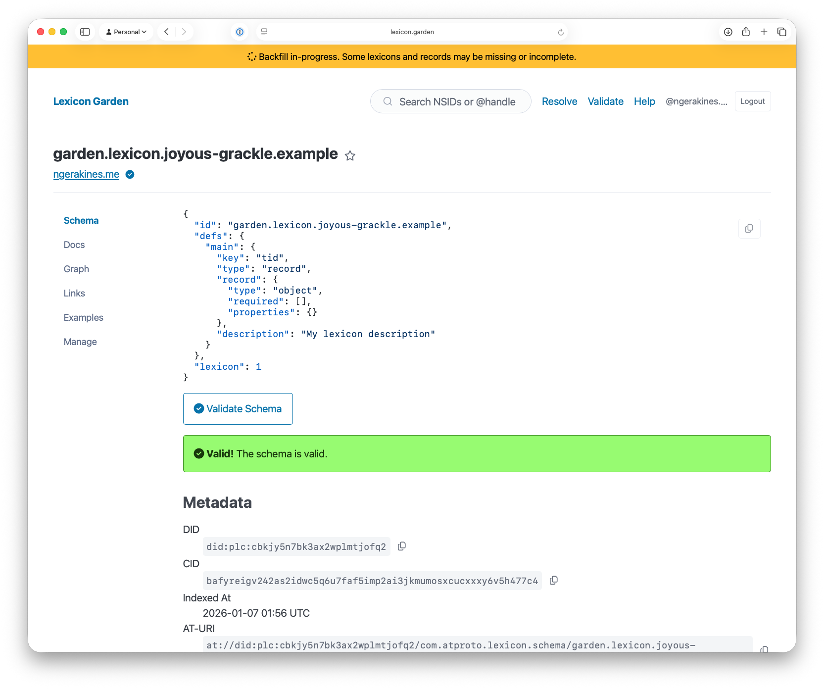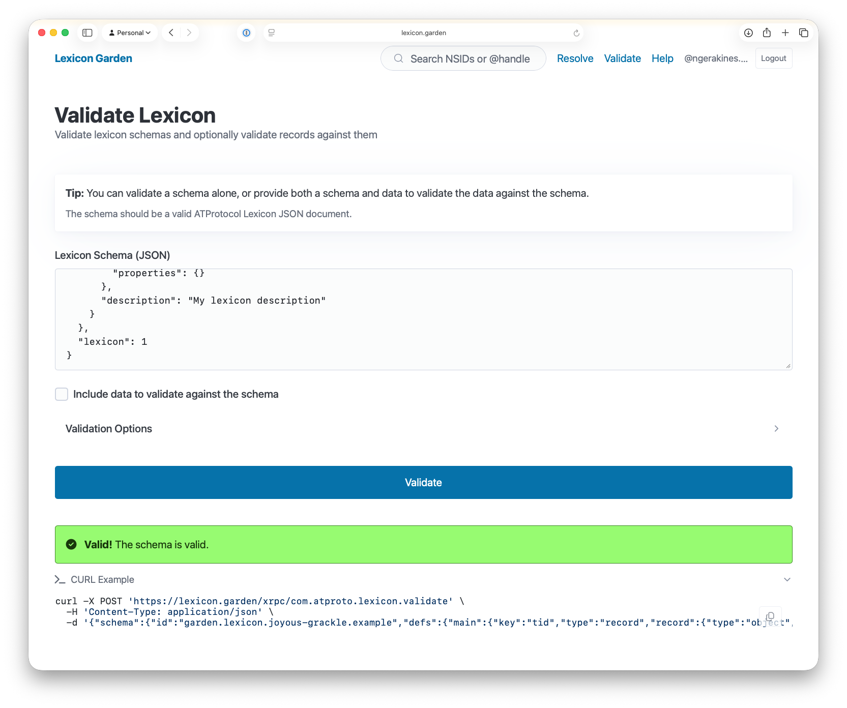 You can also use the standalone validation page at lexicon.garden/validate. Just paste in a schema and click validate, or include record data to check both at once. This helps when you're drafting a new lexicon and want to test ideas quickly before creating anything.